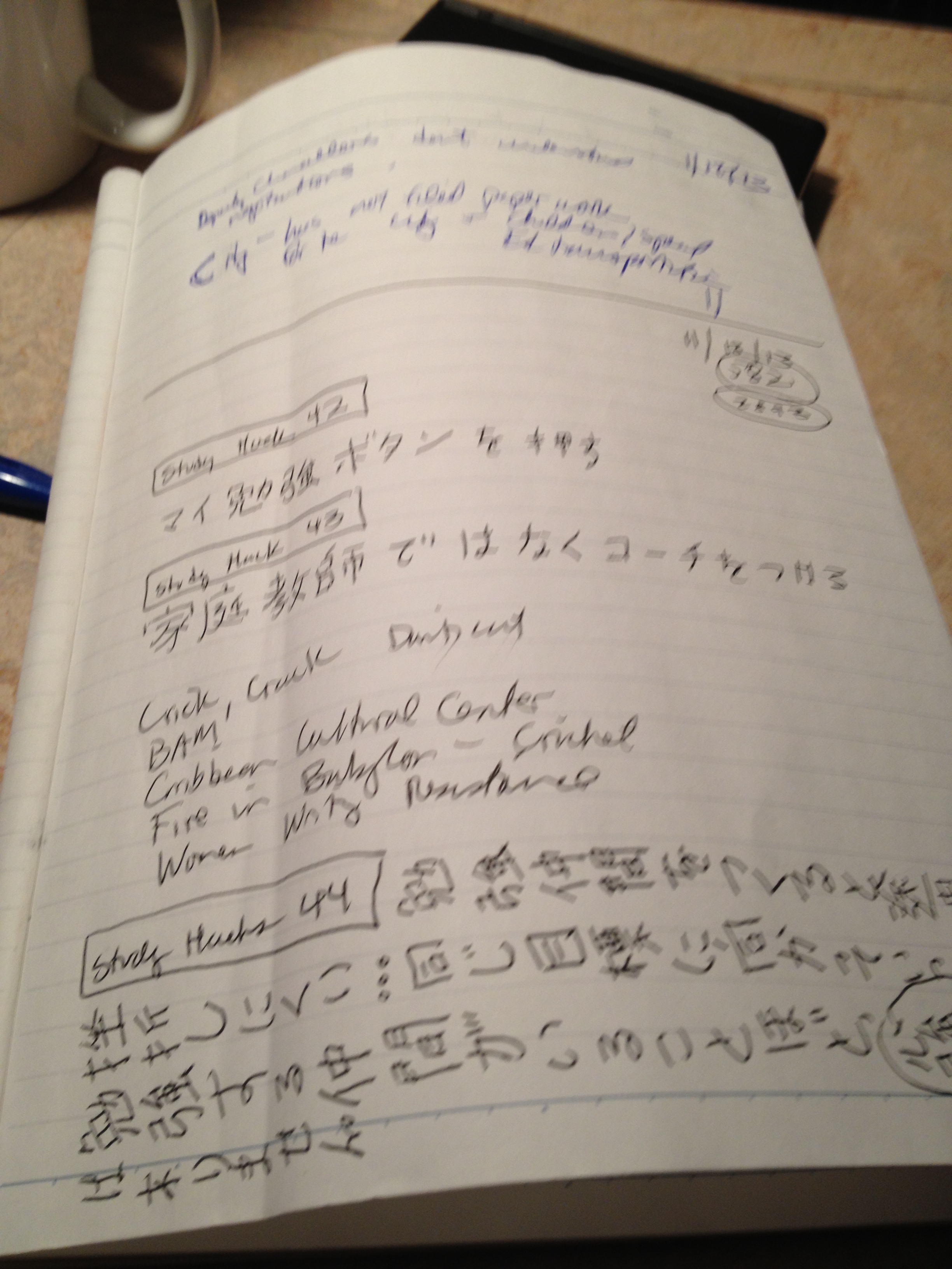 While I’m hunting for the great Snow Leopard that will help me solve my music issues, I am relying more on other tools. Notebooks and podcasts, oh my! Since the iPhone drop incident, I’ve started to spend a little bit more time with my samurai notebook. These are little notebooks that I put interesting and positive ideas and supposedly review on schedule. (Two days, four days, 1 wk, etc). I recently just reviewed a notebook that I won’t have to review again until 2015. The nice thing about real notebooks is that you don’t need to worry about software updates, etc. What inhabits my latest entries in my notebook: the number of kanji I am studying (2893), fun snippets from Study Hacks, notes from a teacher training that were actually useful, and notes from previous notebooks that I want to keep current.
